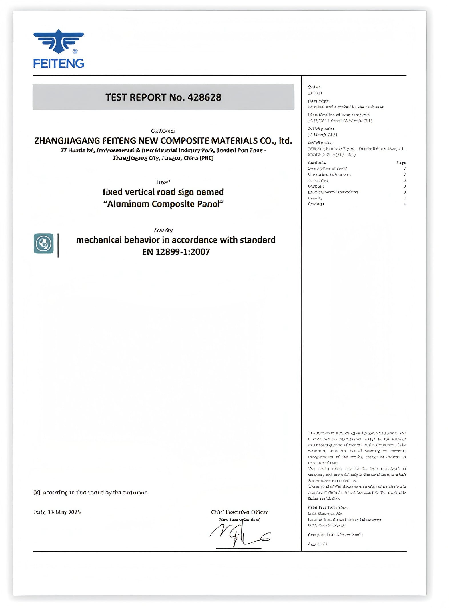 飞腾LYRA交通标识板已正式获得欧洲标准EN 12899-1全面合规认证,这标志着飞腾铝塑板在欧洲交通标识领域取得无限制应用许可。该里程碑式突破将为欧盟道路标识提供经认证的可靠材料解决方案。